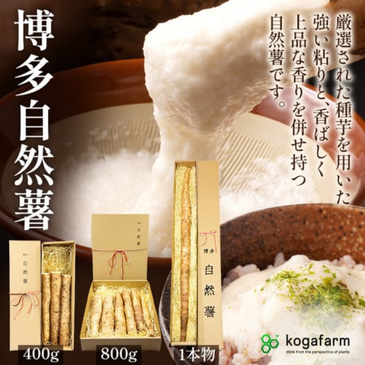 当園の自然薯は、選抜した品種を用い、先人たちから学んだ栽培法で丁寧に育てています。山芋とは異なり、栄養や粘り、香りの面で優れており、その品質の高さを誇るものを「博多自然薯」として提供しています。